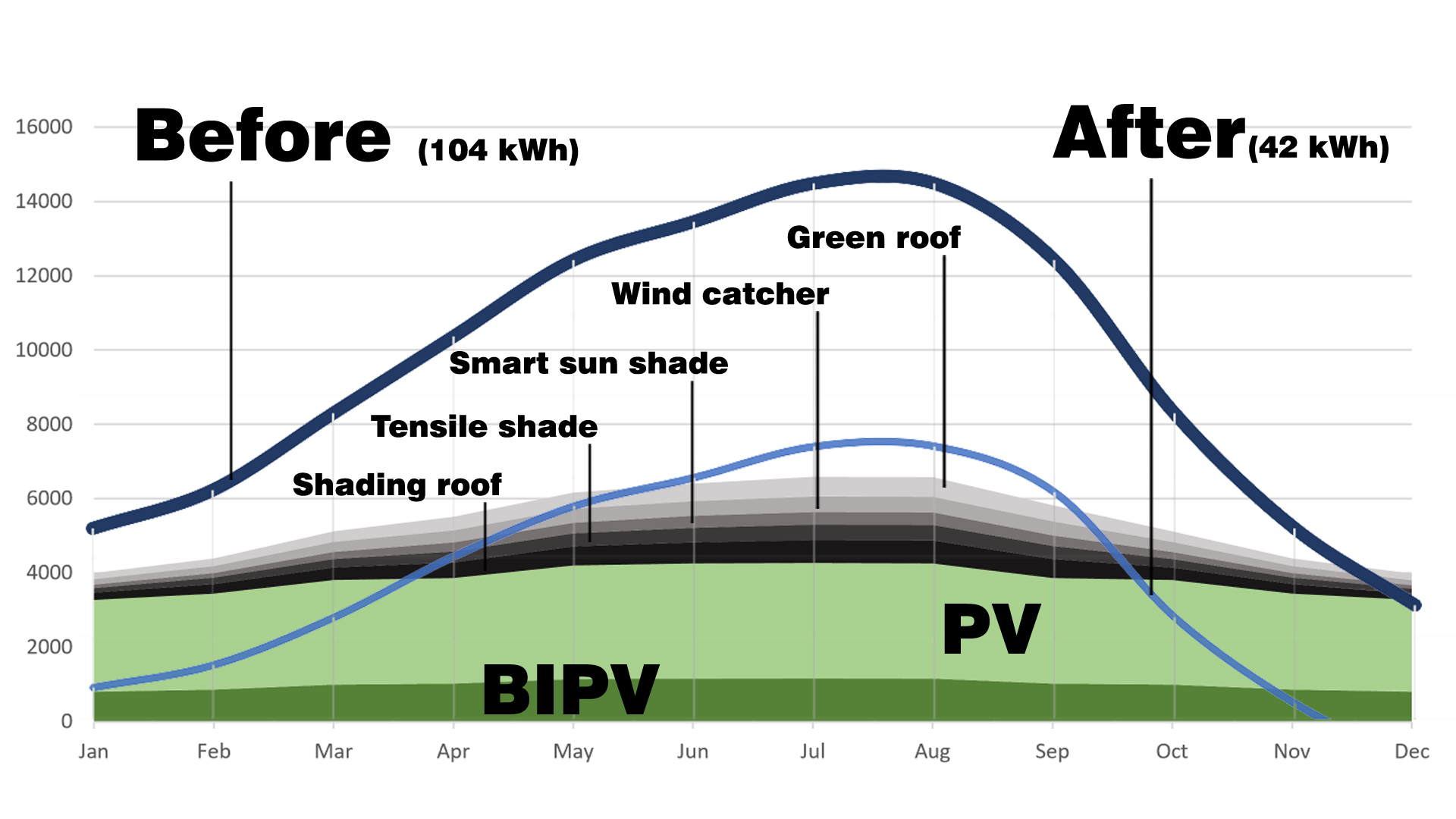 Mehr als 45 % des gesamten Strombedarfs des Gebäudes können durch die eigene Stromproduktion aus der Integration von PVs und BIPVs gedeckt werden. Dieser Anteil kann weiter erhöht werden, wenn ein Batteriespeichersystem implementiert wird. Passive Kühlstrategien werden durch verschiedene technische Komponenten wie den Windfänger, textile Strukturen, das schattenspendende Dach und das grüne Dach umgesetzt. Zusätzlich steuert ein intelligentes Sonnenschutzsystem die Sonneneinstrahlung und optimiert so die Kühlung und Energieeffizienz.