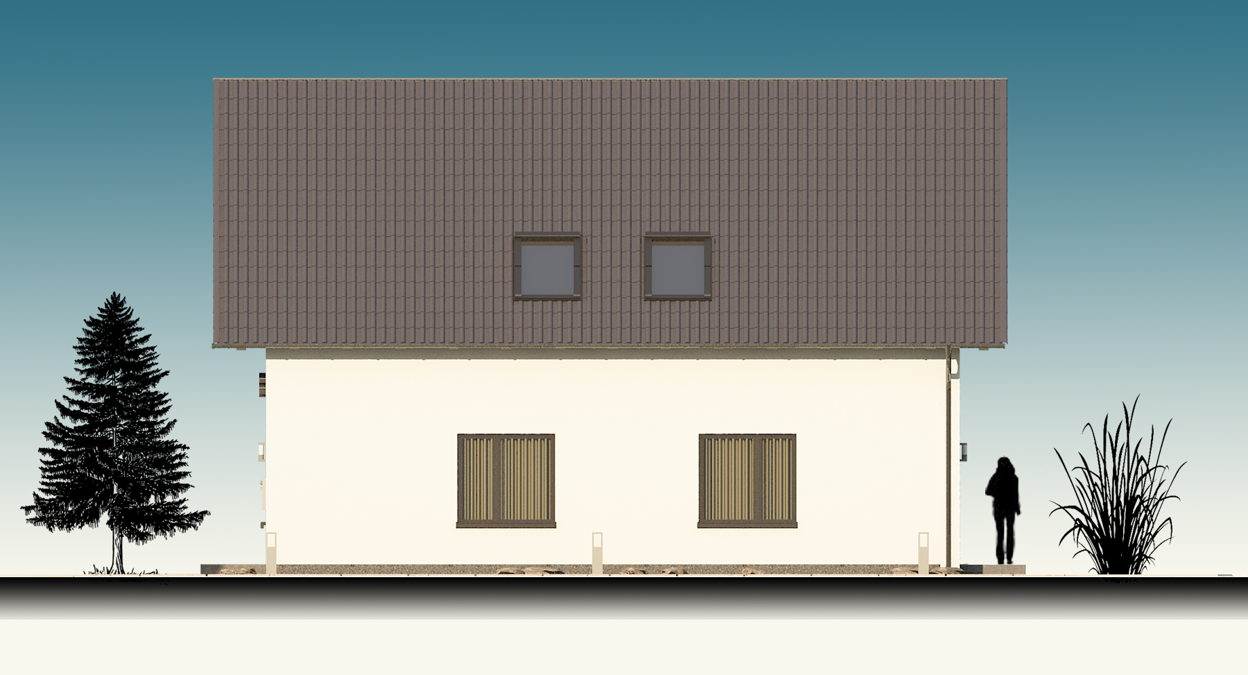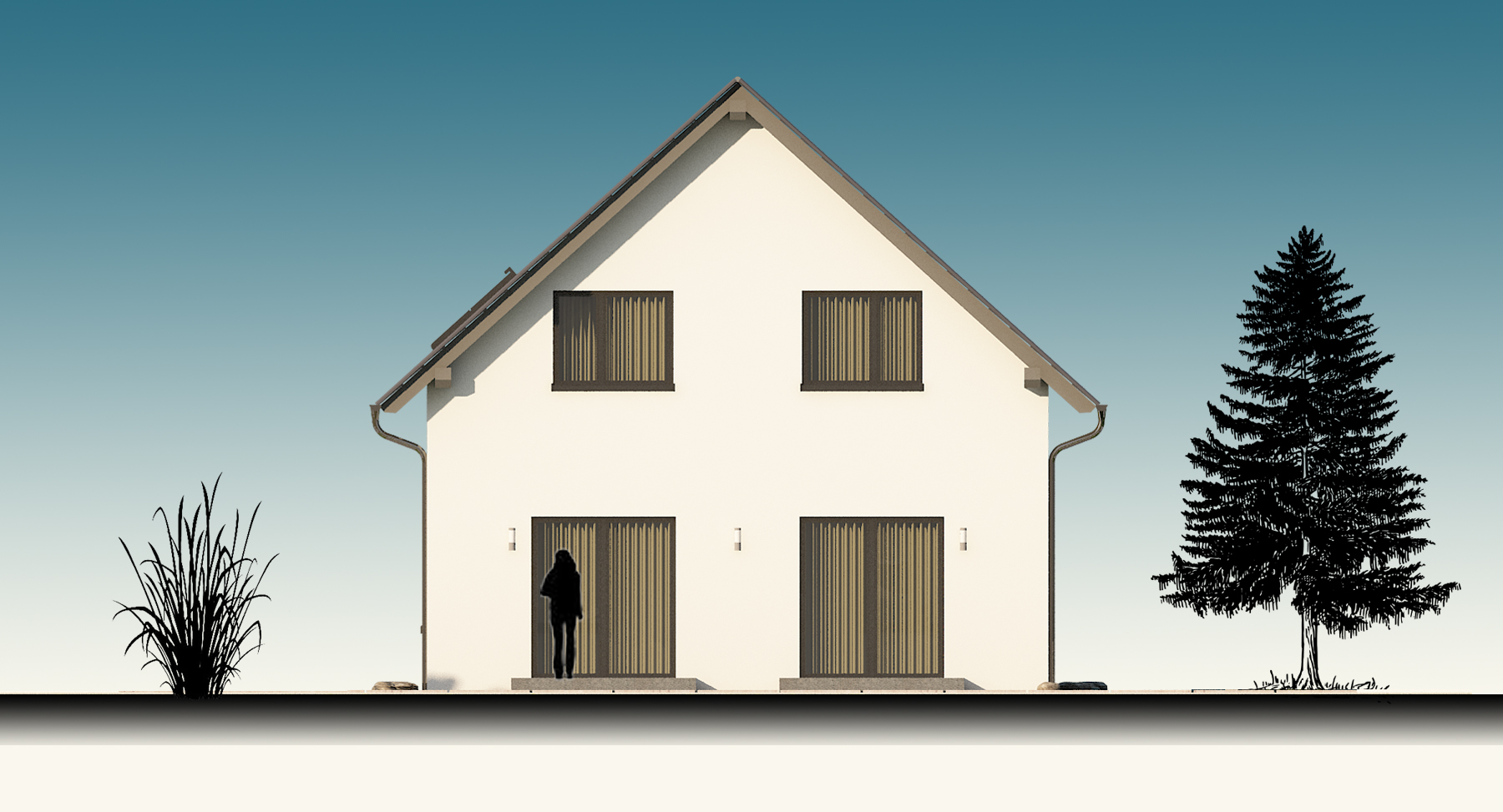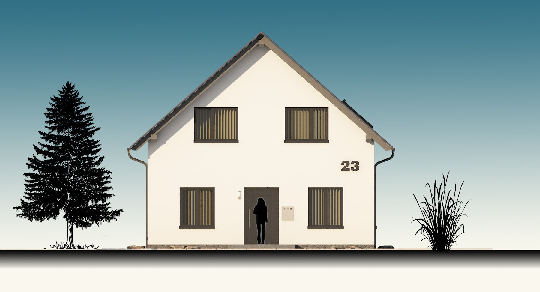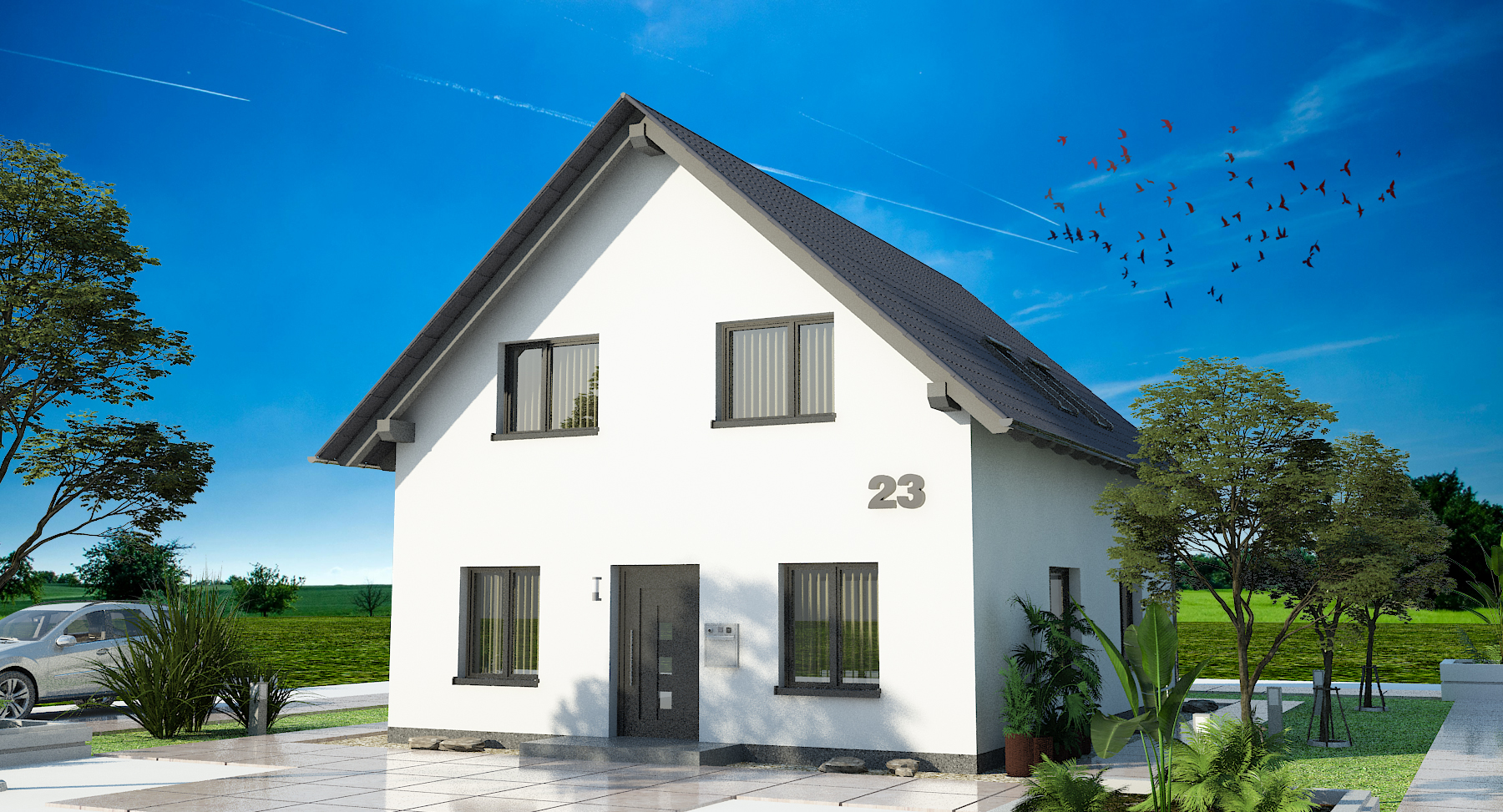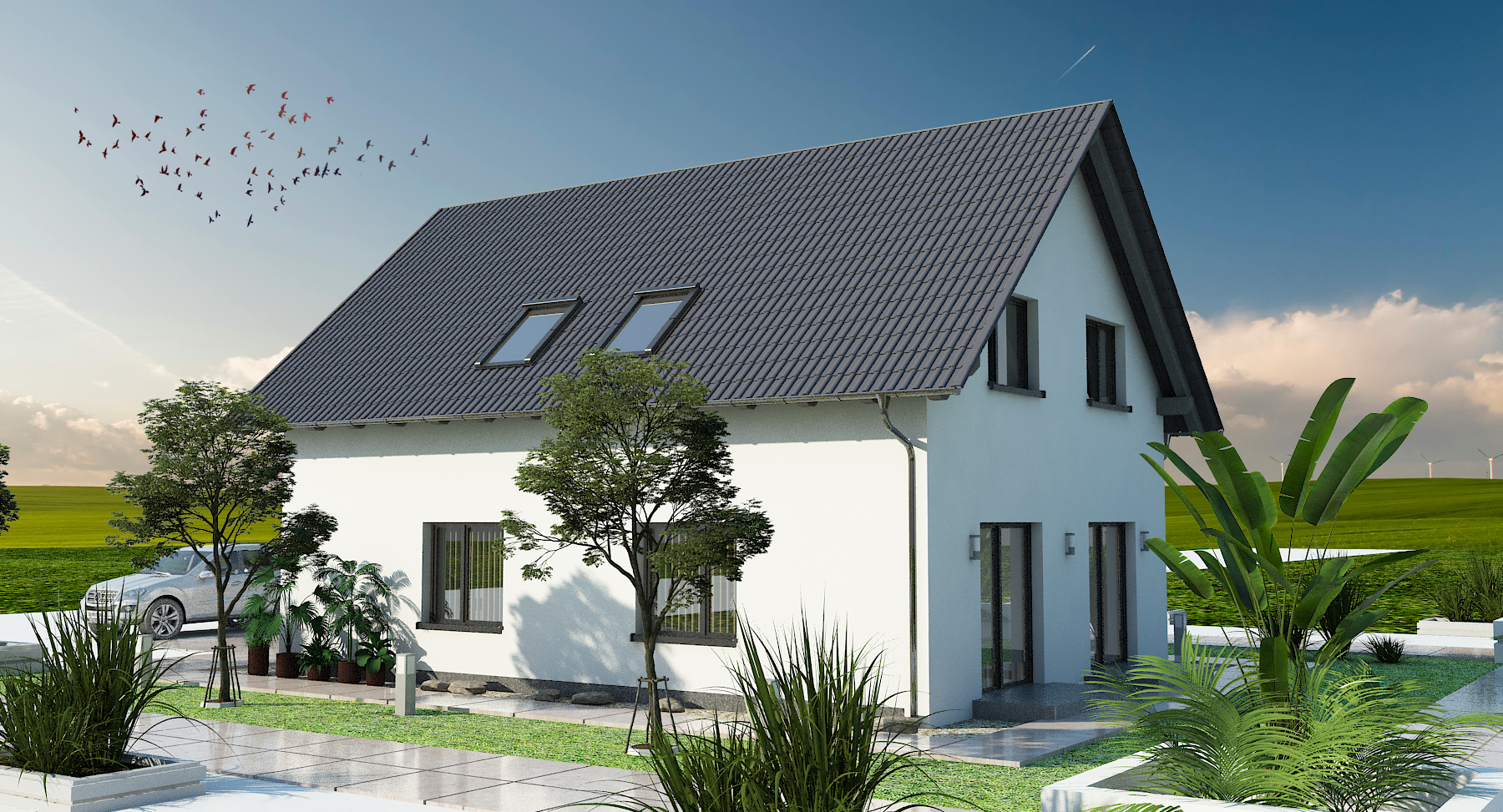 Als Beispiel wurde ein zweigeschossiges Einfamilienhaus mit einem Süd-Nord-Satteldach visualisiert und simuliert. Nachfolgend werden die vier Hauptleistungen von Visuell+ in der Reihenfolge der Leistungen und ihrem Inhalt dargestellt.
