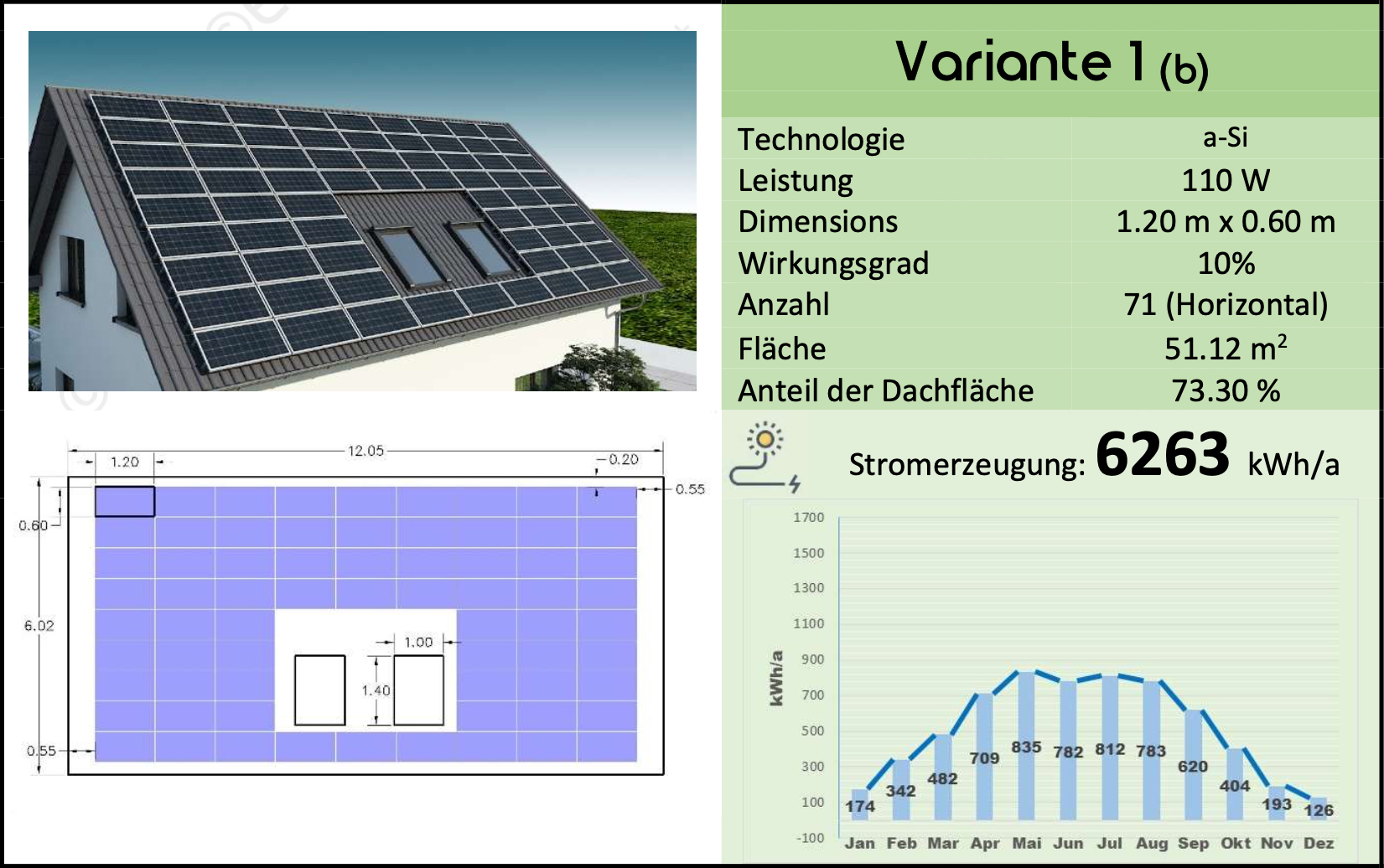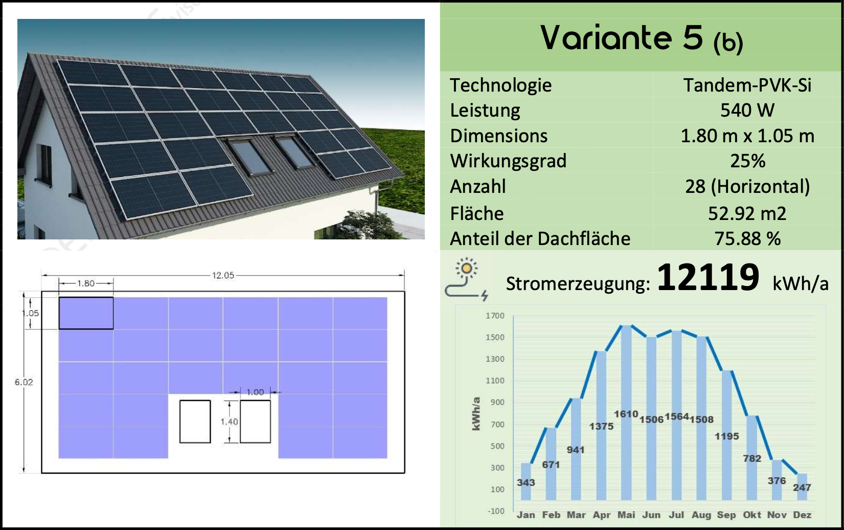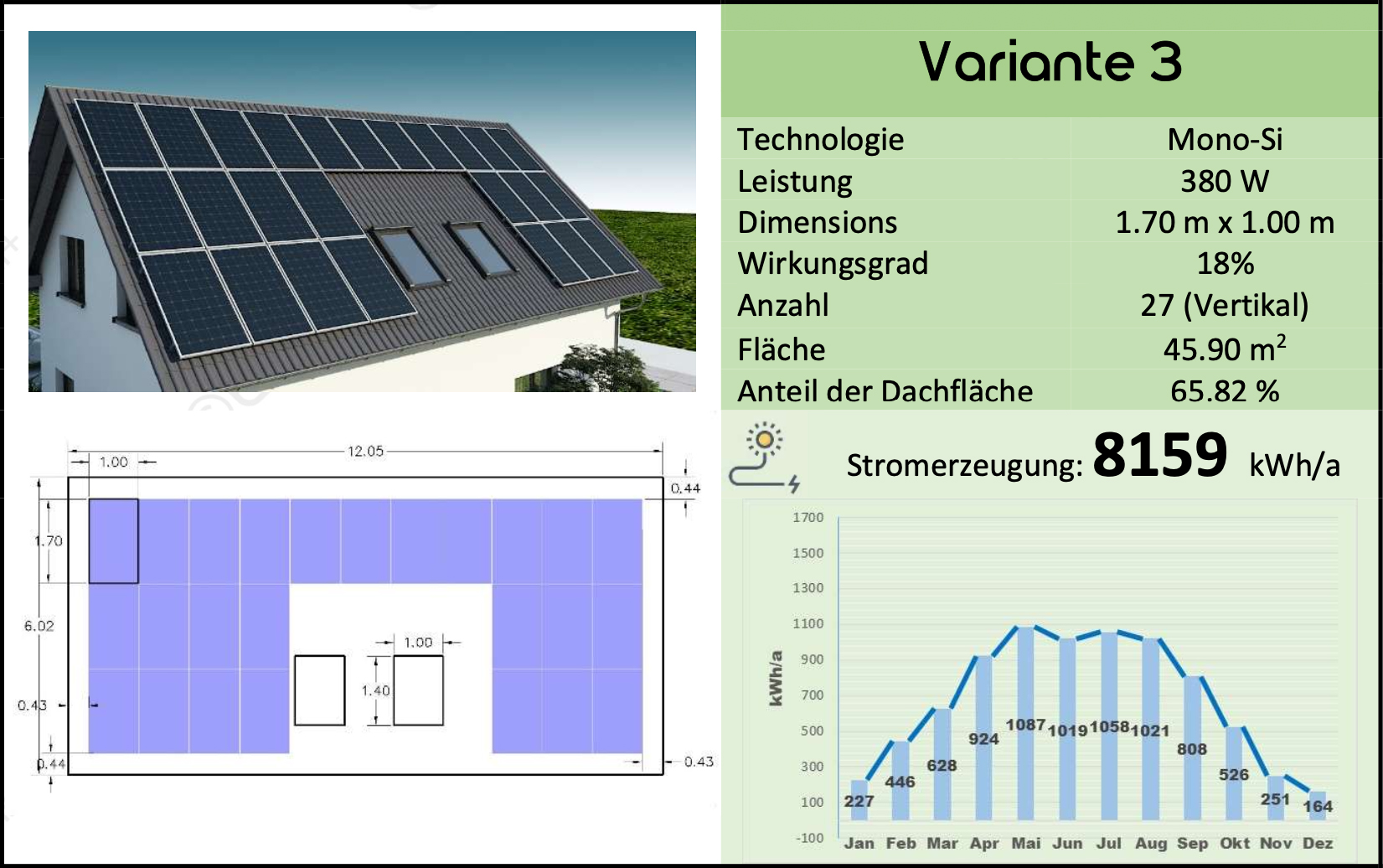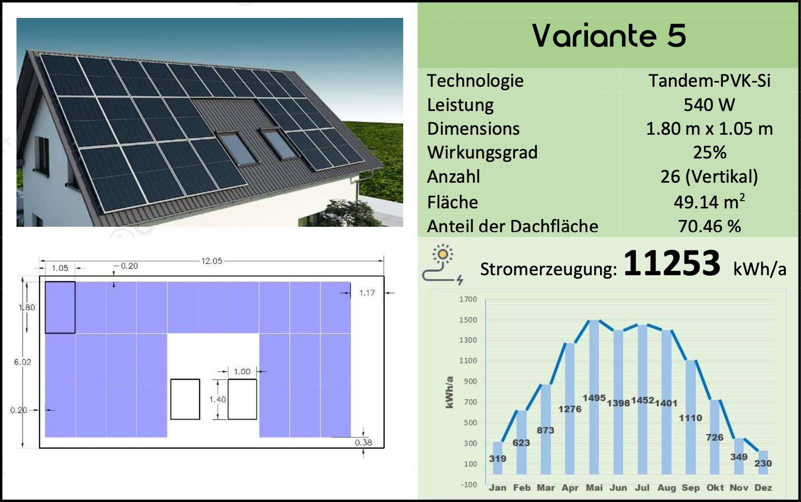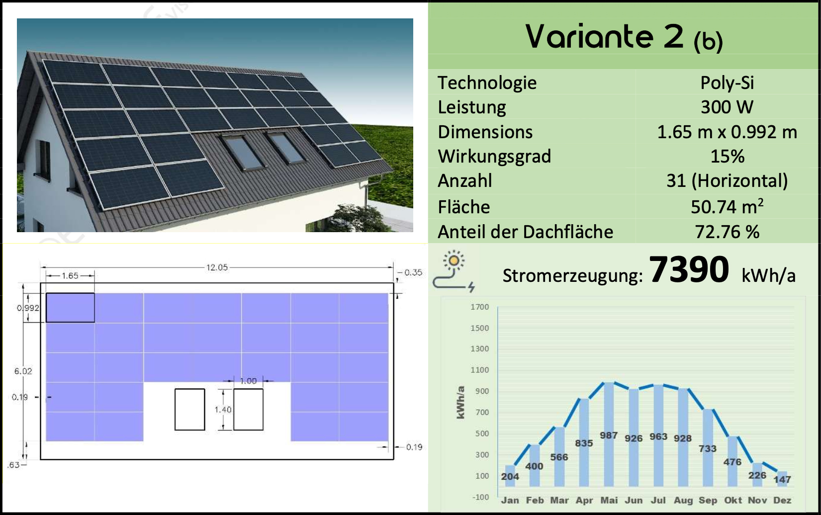 In diesem Vergleich unterscheiden sich die Abmessungen und Proportionen des Dachs und der ausgewählten PV, die Anzahl der montierbaren PV-Module und die endgültige Stromerzeugung von den ersten fünf Varianten mit vertikaler Installation.