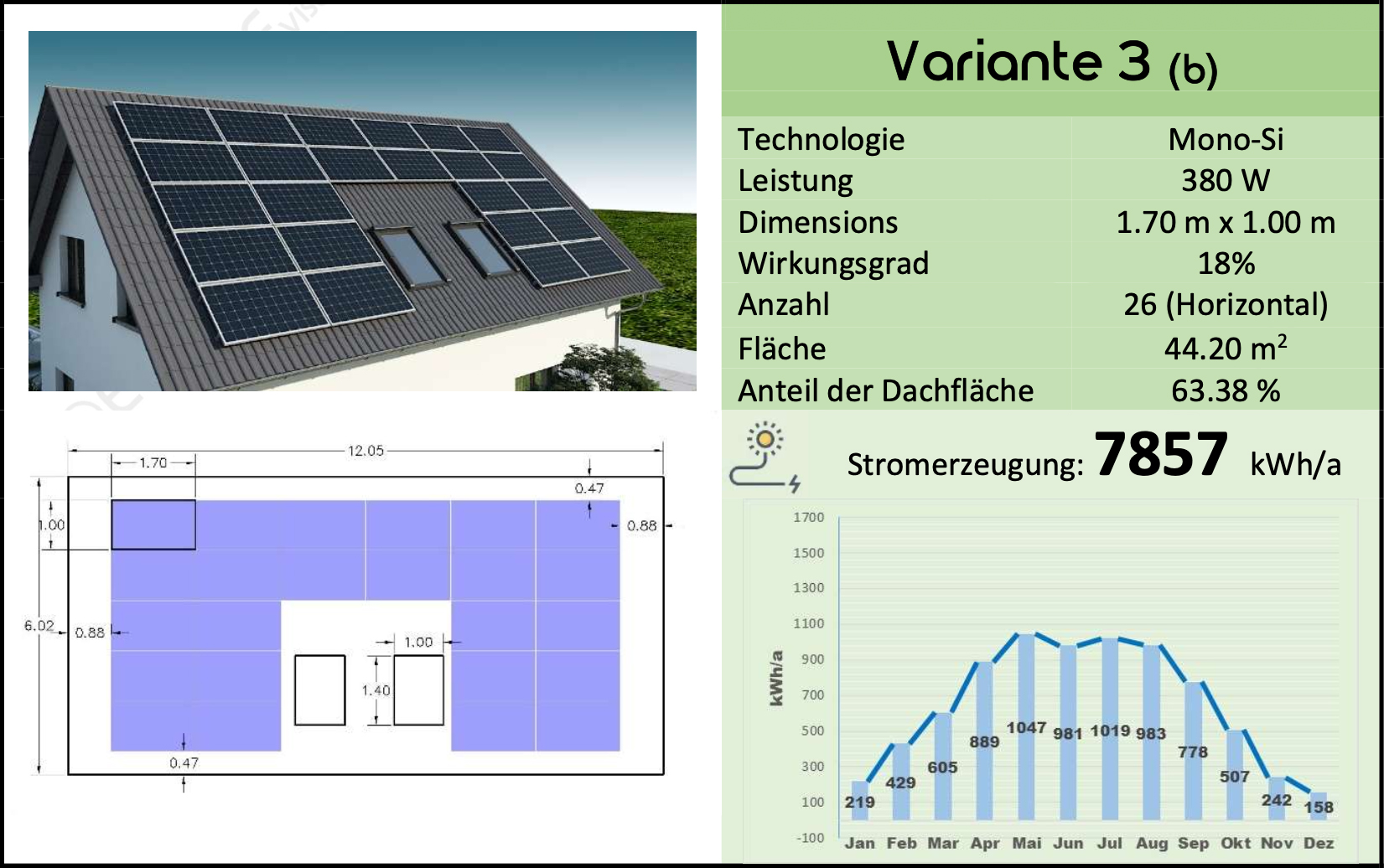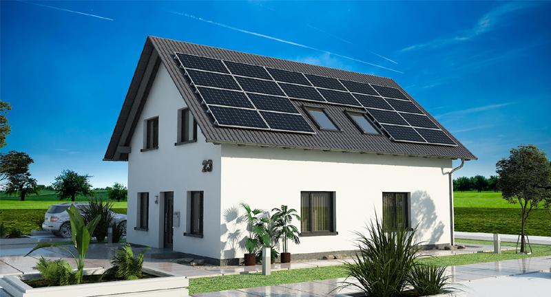 Zur Veranschaulichung wird hier ein Beispiel für ein Einfamilienhaus mit einem nach Süden und Norden geneigten Dach vorgestellt.