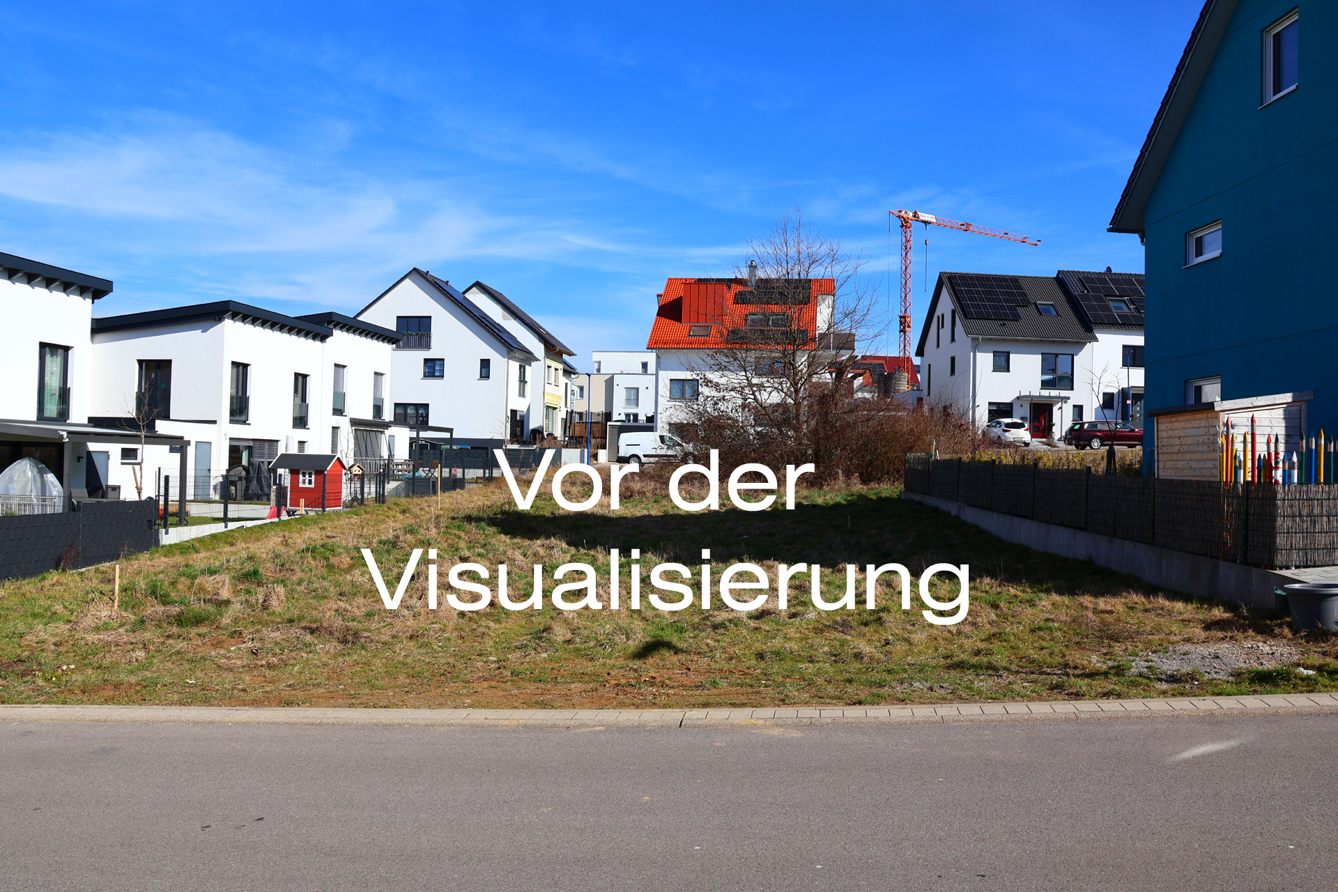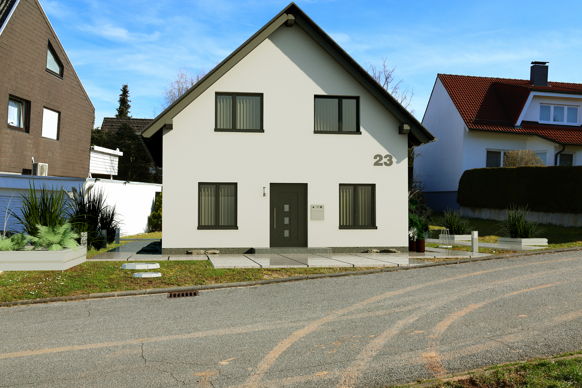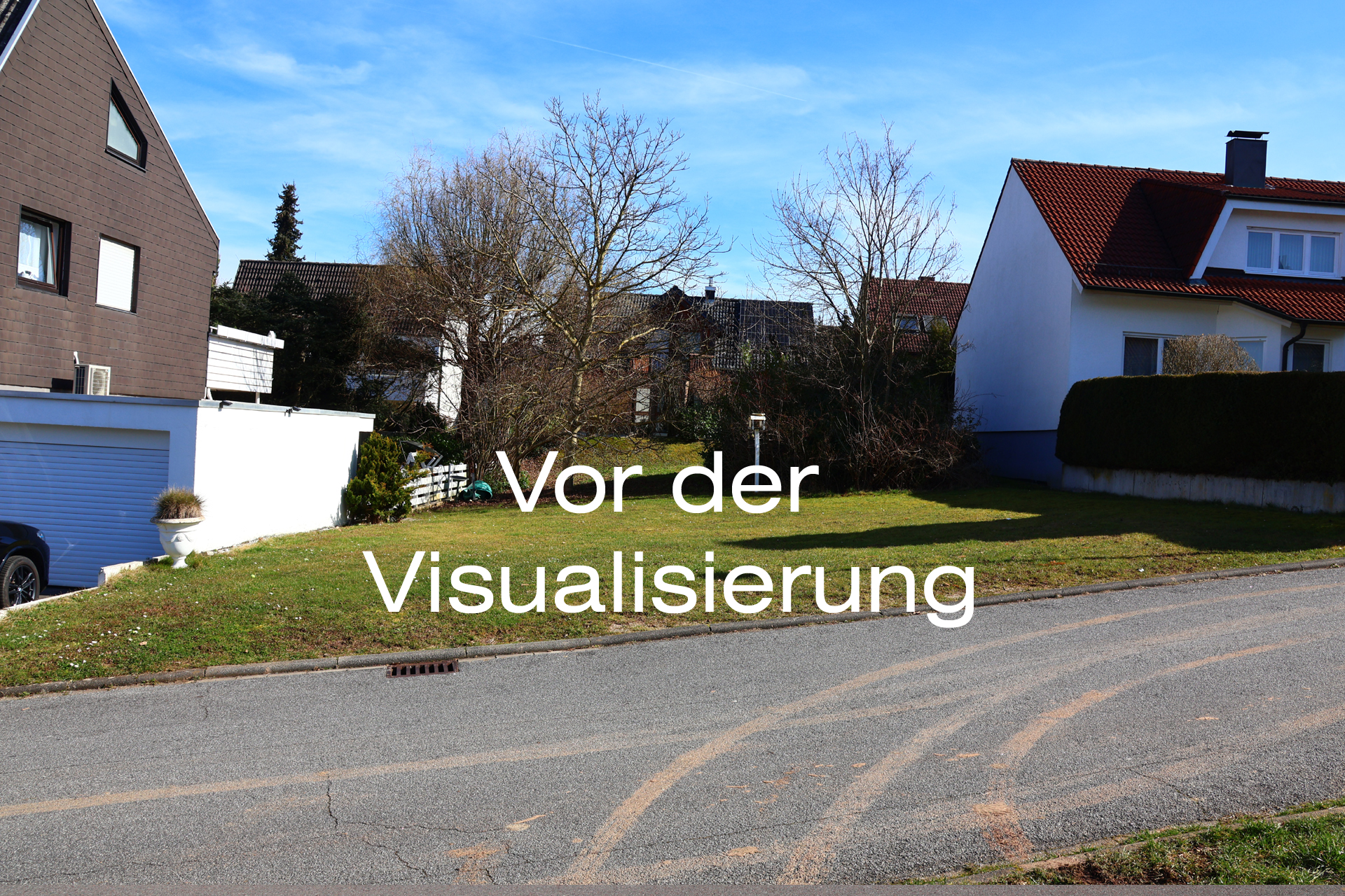In diesem Projekt wurden drei Bilder des Hauses realistisch in die bestehende Umgebung integriert. Diese Bilder können entweder gemeinsam mit dem Bauherrn aufgenommen oder durch Google Maps Services generiert werden. Alternativ können wir die Bilder für eine bessere Qualität auch gerne selbst vor Ort aufnehmen.