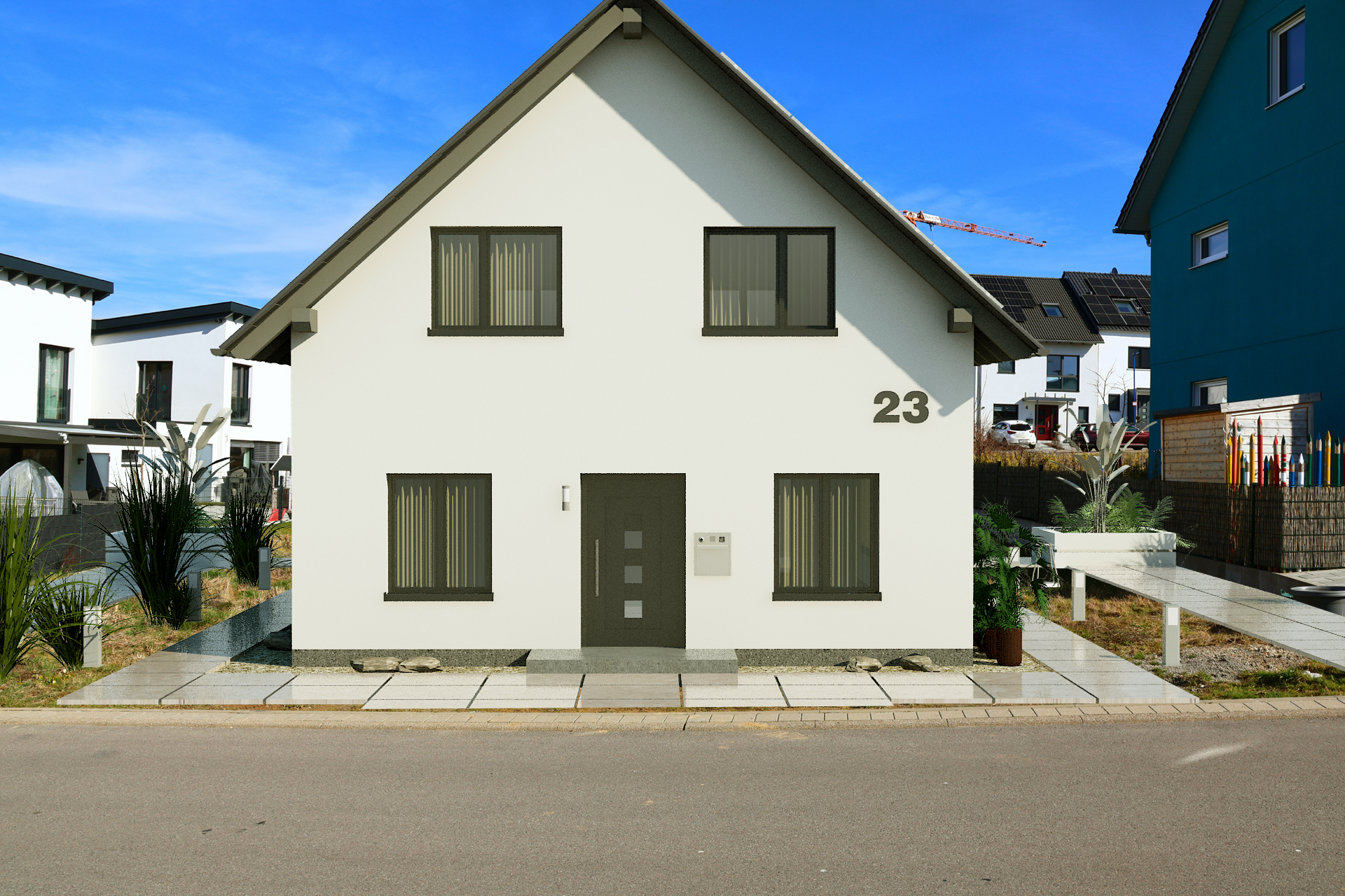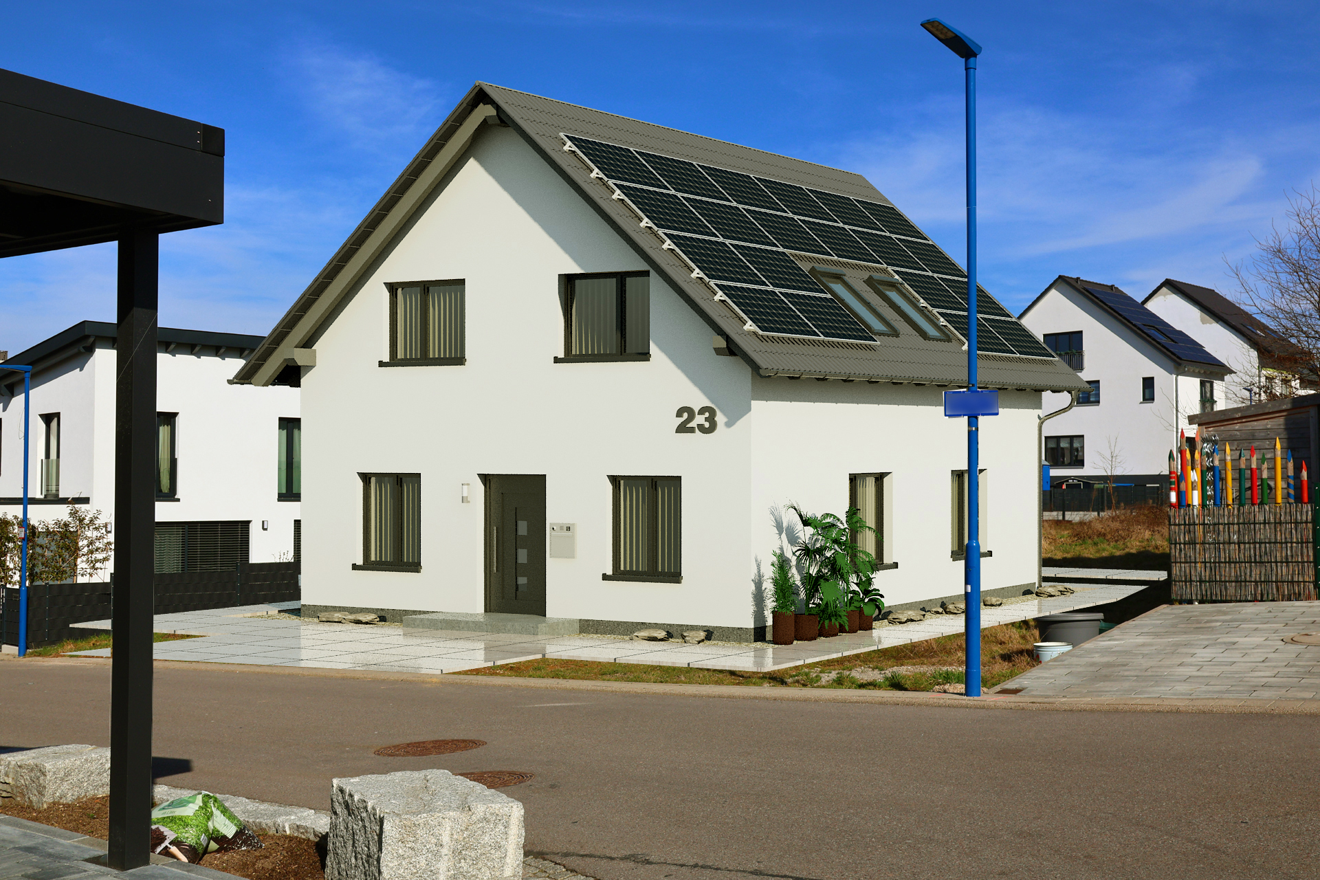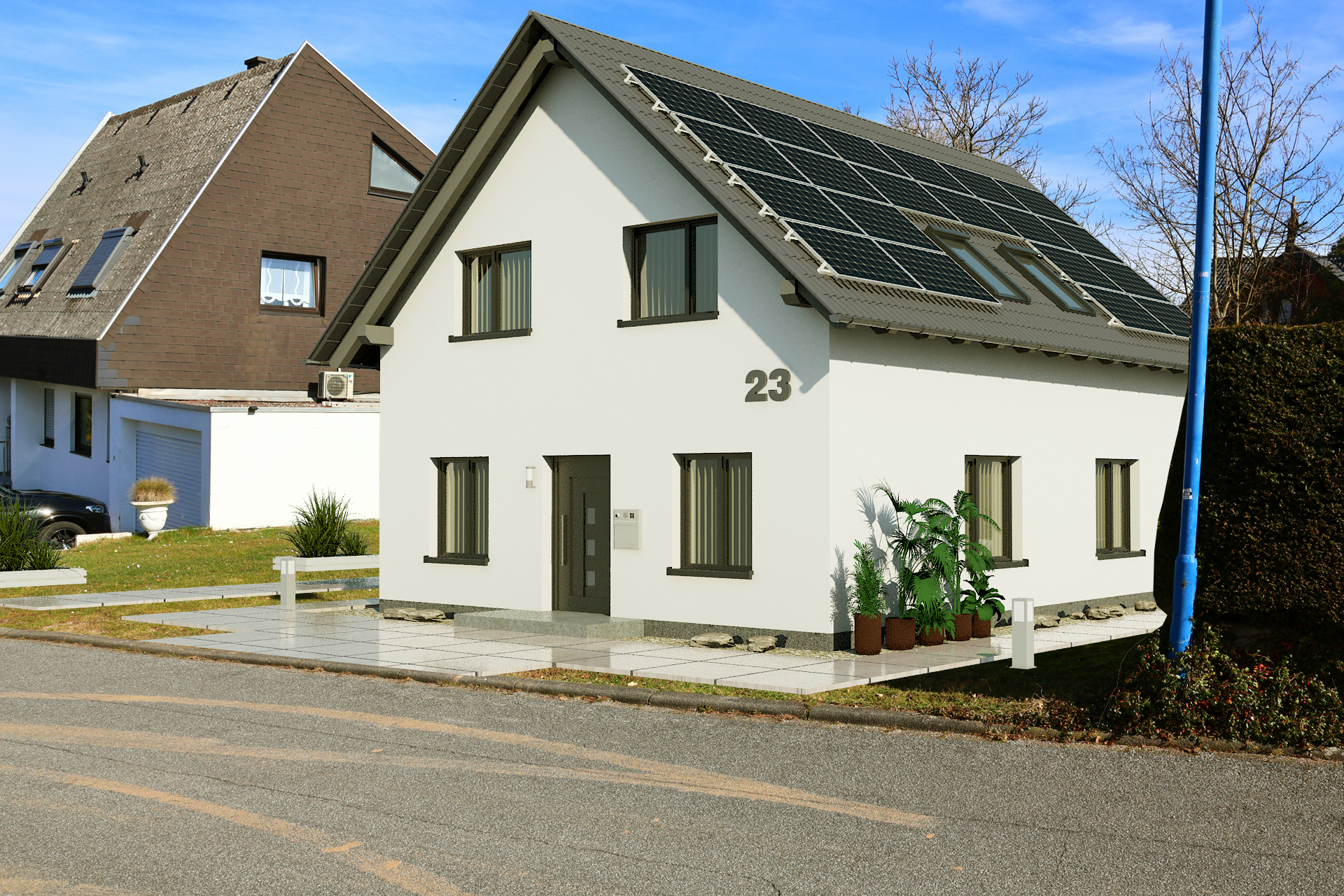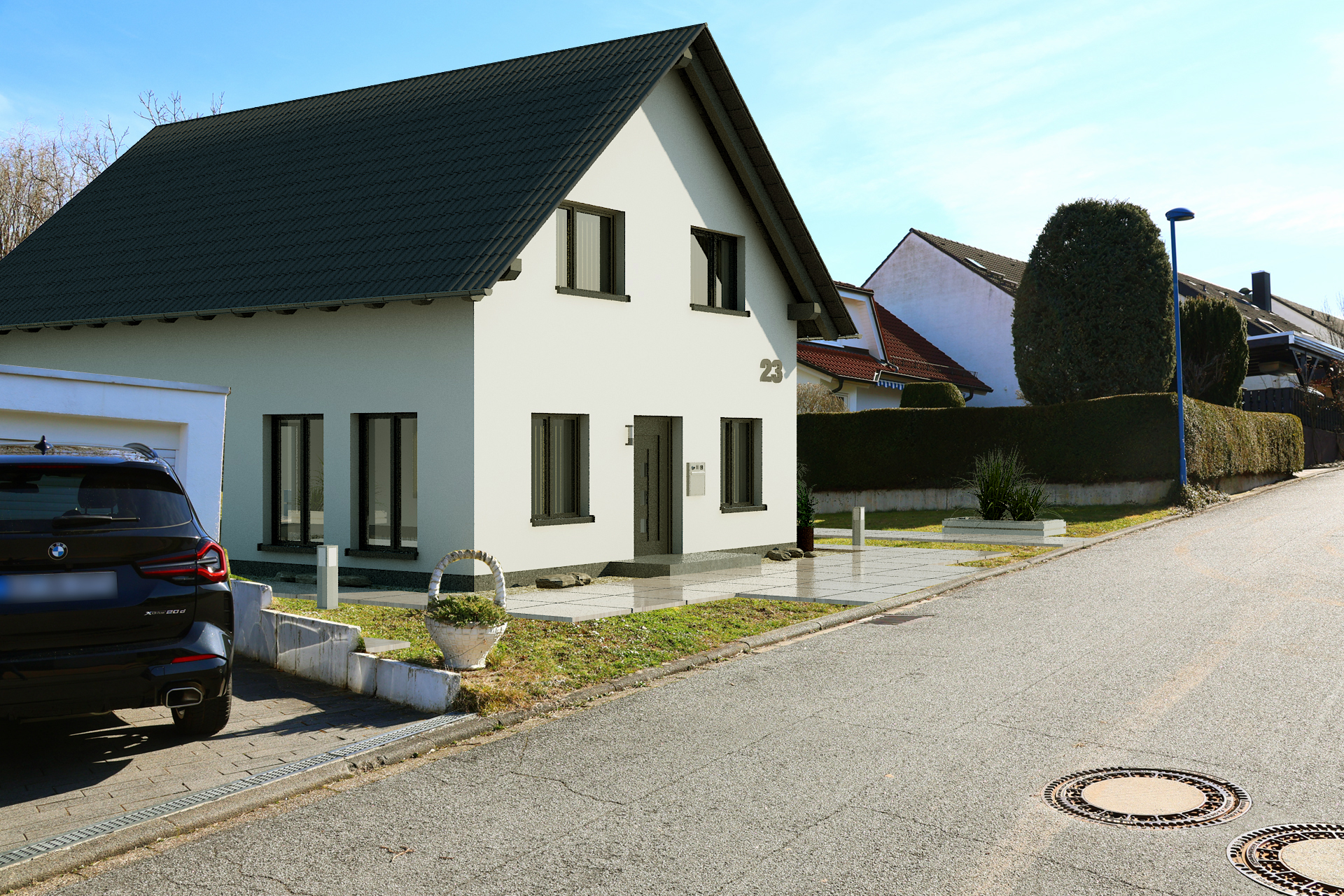 In diesem Projekt wurden drei Bilder des Hauses realistisch in die bestehende Umgebung integriert. Diese Bilder können entweder gemeinsam mit dem Bauherrn aufgenommen oder durch Google Maps Services generiert werden. Alternativ können wir die Bilder für eine bessere Qualität auch gerne selbst vor Ort aufnehmen.