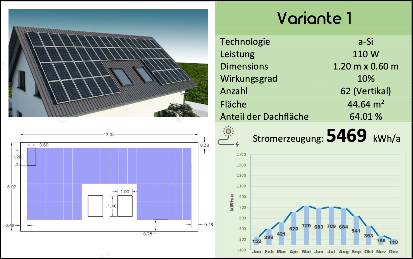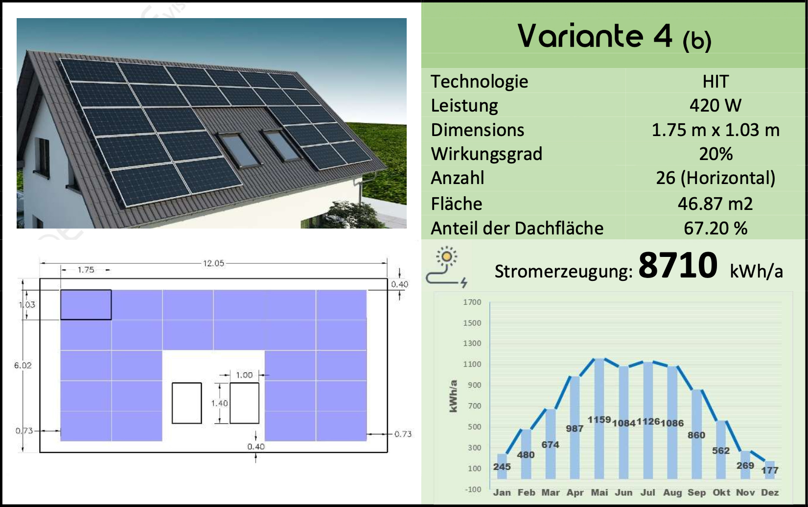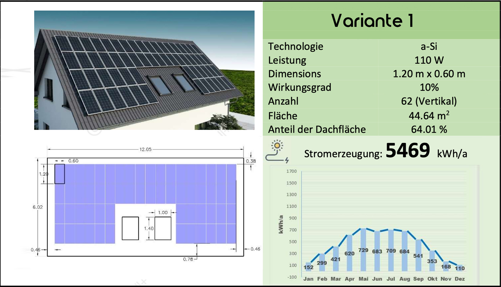 In diesem Vergleich unterscheiden sich die Abmessungen und Proportionen des Dachs und der ausgewählten PV, die Anzahl der montierbaren PV-Module und die endgültige Stromerzeugung von den ersten fünf Varianten mit vertikaler Installation.