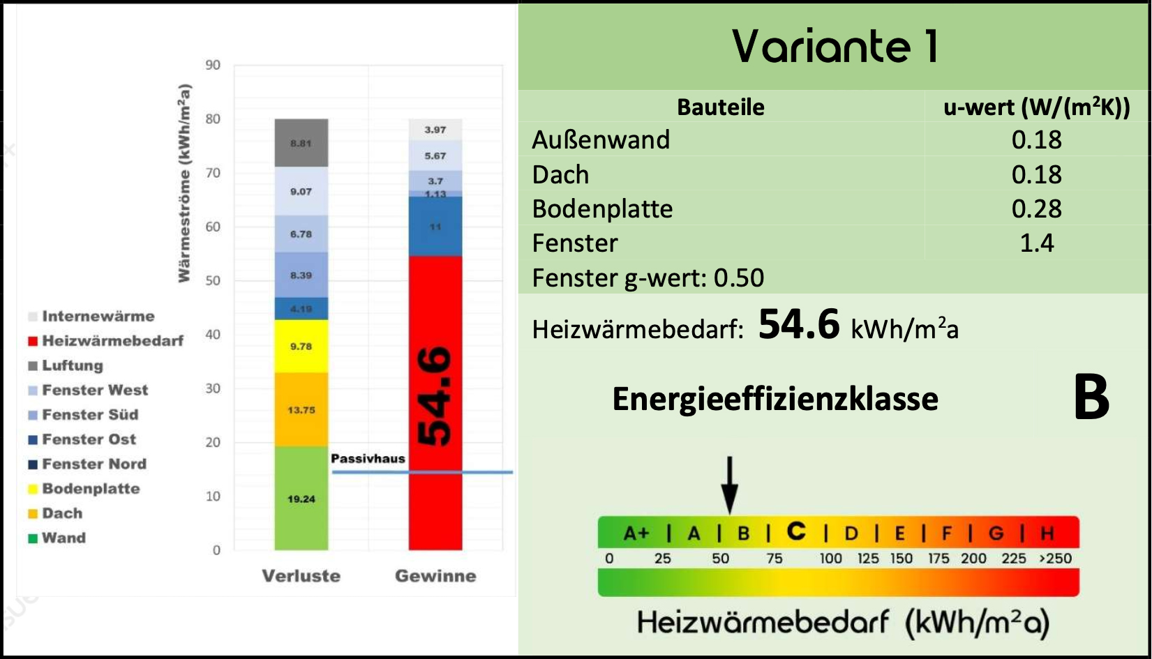 Sollte es also auf dem Markt im Hinblick auf Preis und Kundenentscheidung einen besseren g-Wert der Fenster geben, werden durch fünf weitere Varianten auch Änderungen der Energieeffizienzklasse des Gebäudes vorhergesagt.