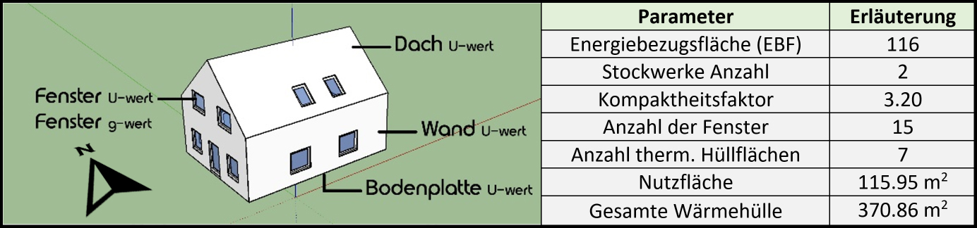 Die zehn Varianten von Heizwärmebedarf verwenden zehn verschiedene Konfigurationen von Wänden, Dächern, Decken und Fenstern und bieten eine Richtlinie zur Vorhersage, welche Energieeffizienzklasse das Gebäude erreichen kann.