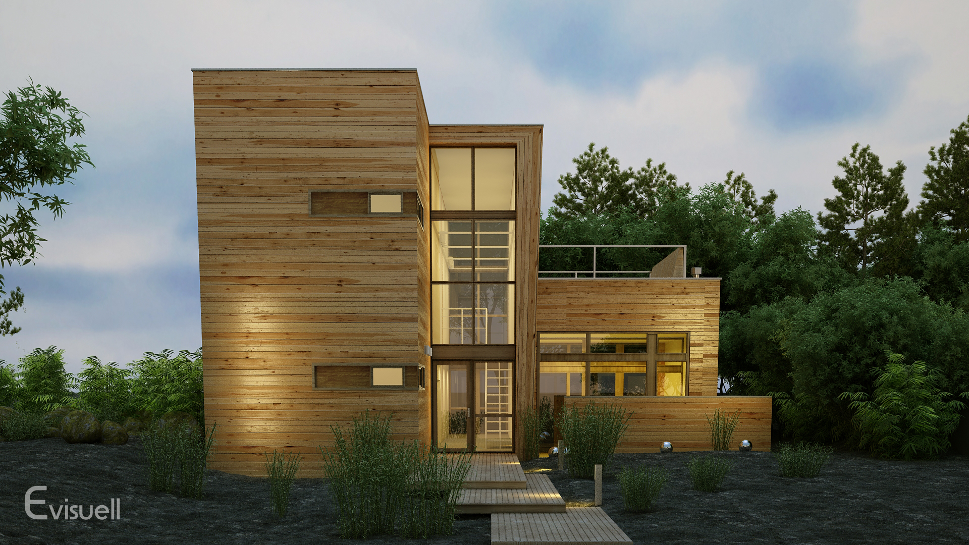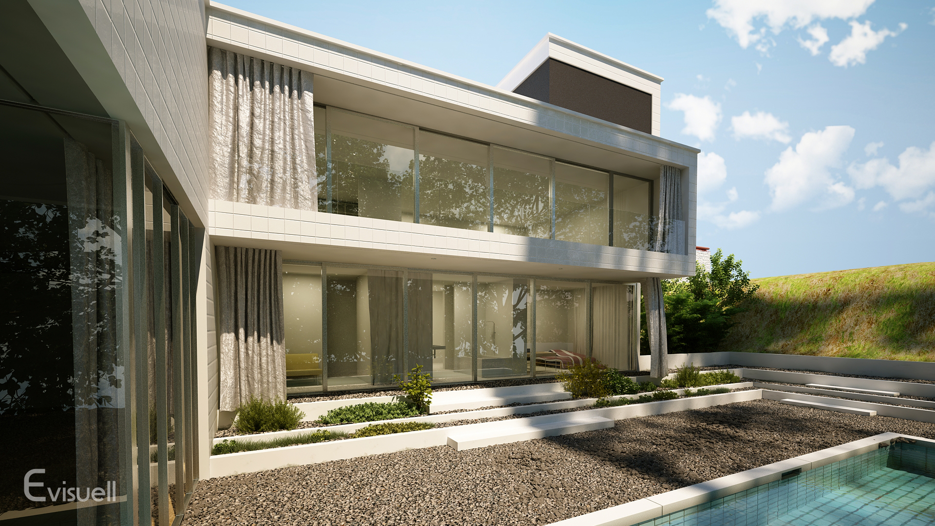 In diesen Visualisierungen wird der neueste Stand der Außendarstellungstechnik eingesetzt, um natürliche virtuelle Bilder zu liefern. Außenmöbel, unterschiedliche Tag- und Nachtbeleuchtungen sowie natürliche Bepflanzungen werden in Nahaufnahmen präsentiert, um die Qualität dieses Prozesses zu demonstrieren.